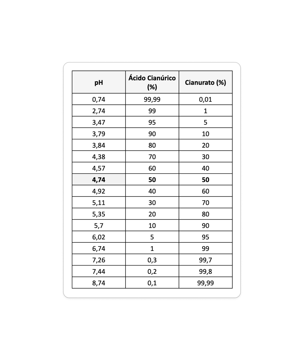 A tabela abaixo mostra a porcentagem de ácido cianúrico vs. cianurato em diferentes valores de pH: